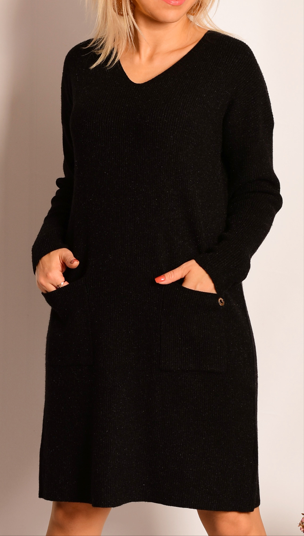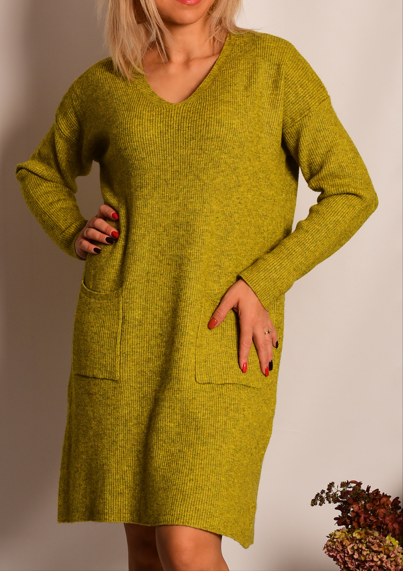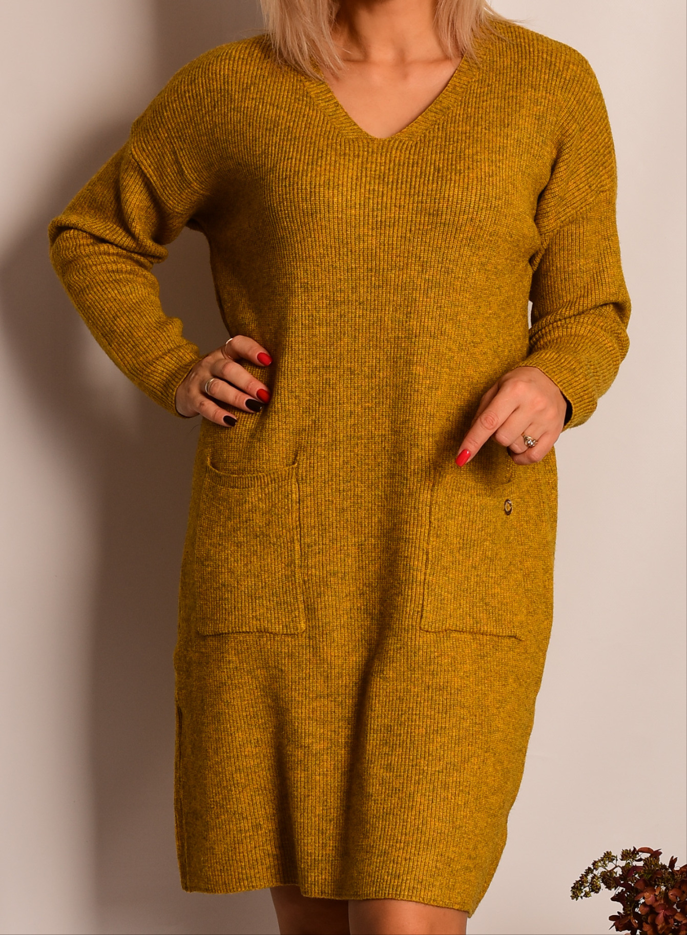 Sukienka sweterkowa prążkowana. Dekolt w serek. Posiada 2 naszywane kieszenie. Kolory mogą się trochę różnić od rzeczywistych. Wynika to z indywidualnych ustawień monitora i karty graficznej.